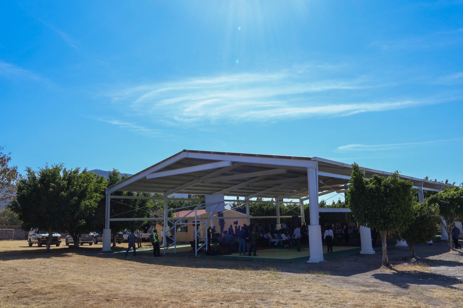 La techumbre, lograda con recursos del Fondo de Infraestructura Social para las Entidades (FISE), ya brinda protección de las inclemencias del tiempo en una superficie de 563.14 metros cuadrados y beneficia de manera directa a más de 200 estudiantes del plantel.